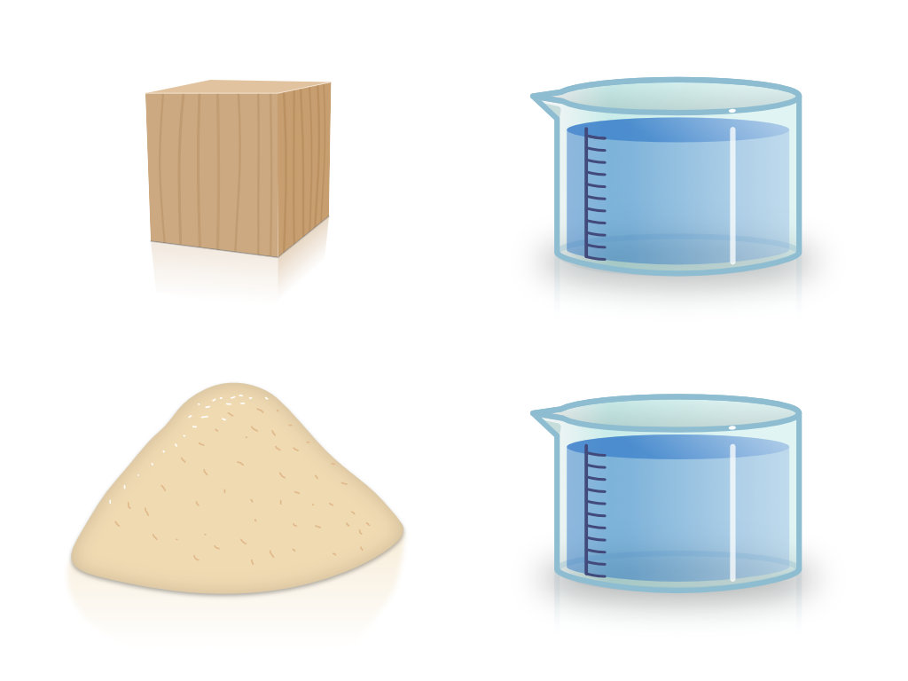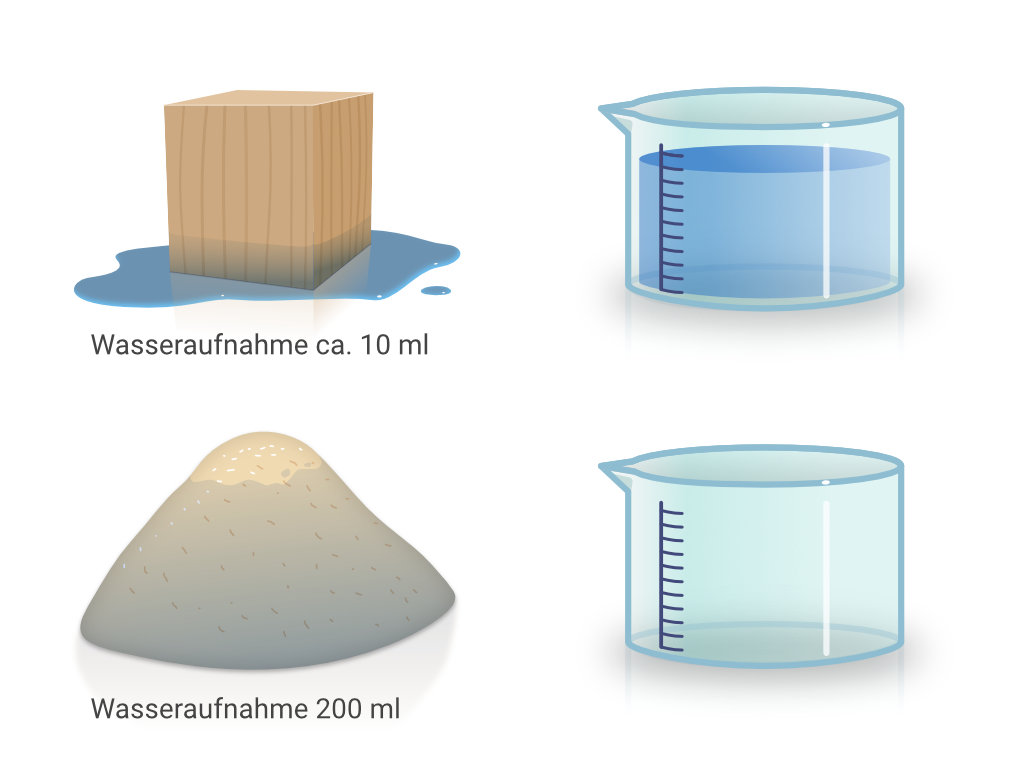 Auch beim Quellen durch Wasser oder Feuchtigkeit hat die Stabplatte gegenüber den Platten auf Sägemehl-Basis deutlich die Nase vorn. Grund dafür ist ihre geringe Oberfläche: Stellt man ein Kantholz von 10×10×10 cm in ein Glas mit 200 ml Wasser werden – je nach Holzart, Wachstum und Lage – ca. 10 ml Flüssigkeit aufgenommen. Reibt man aber das Holz zu feinem Sägemehl, saugt es die ganze Flüssigkeit auf. Das ist gut wenn Sie Öl verloren haben, aber nicht bei Luftfeuchtigkeit oder einem Wasserschaden (siehe Abbildung).